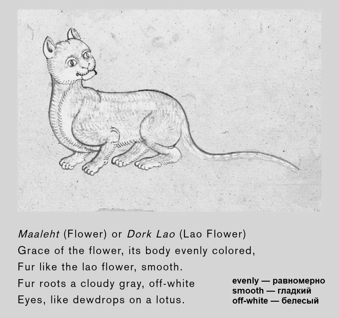 Комментарий: Тамра́ Мэ́у - это каталог пород кошек, собиравшийся в 14-18 веках, и восстановленный в Бангкоке в 18 веке. В содержащихся в нем стихах достаточно подробно описываются визуальные признаки пород, что позволяет предположить, что там собраны стандарты для заводчиков.
