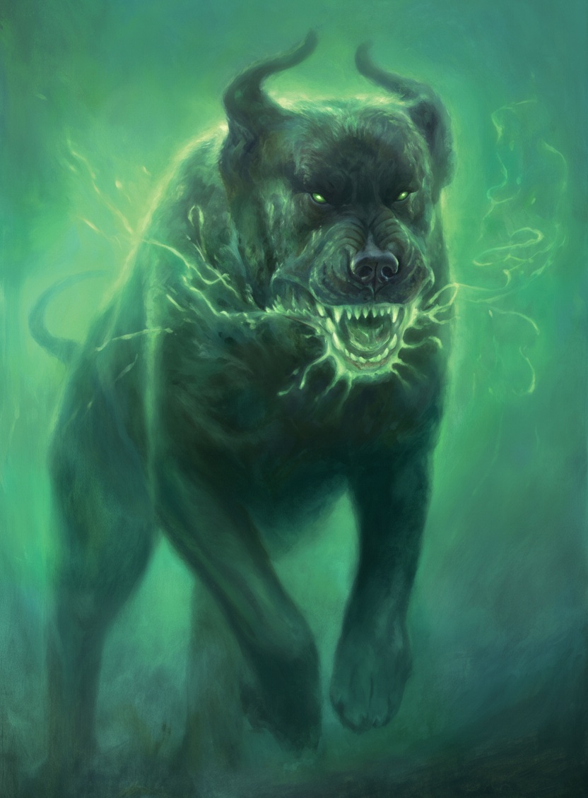 Собака баскервилей описывается как черный пес со светящейся пастью и глазами.