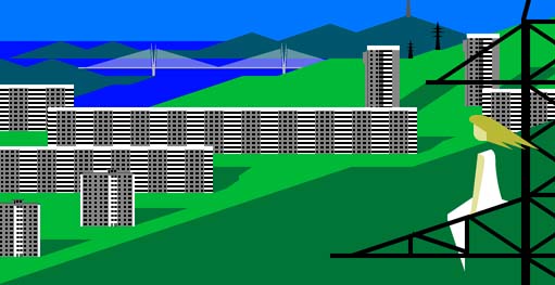 Комментарий: Это иллюстрация к посту Виктора Аргонова о написанной им техно-опере "Русалочка", известной вам из недавно услышанного вопроса. :-) На раздаточном материале видно, что у девушки, сидящей на опоре ЛЭП, вместо ног — стилизованный хвост русалки.