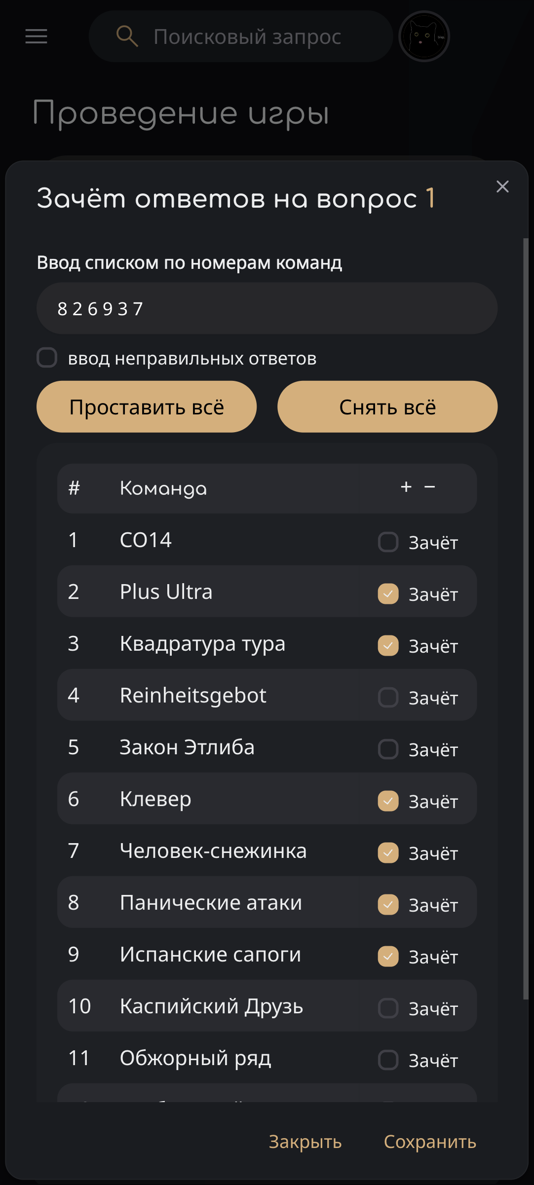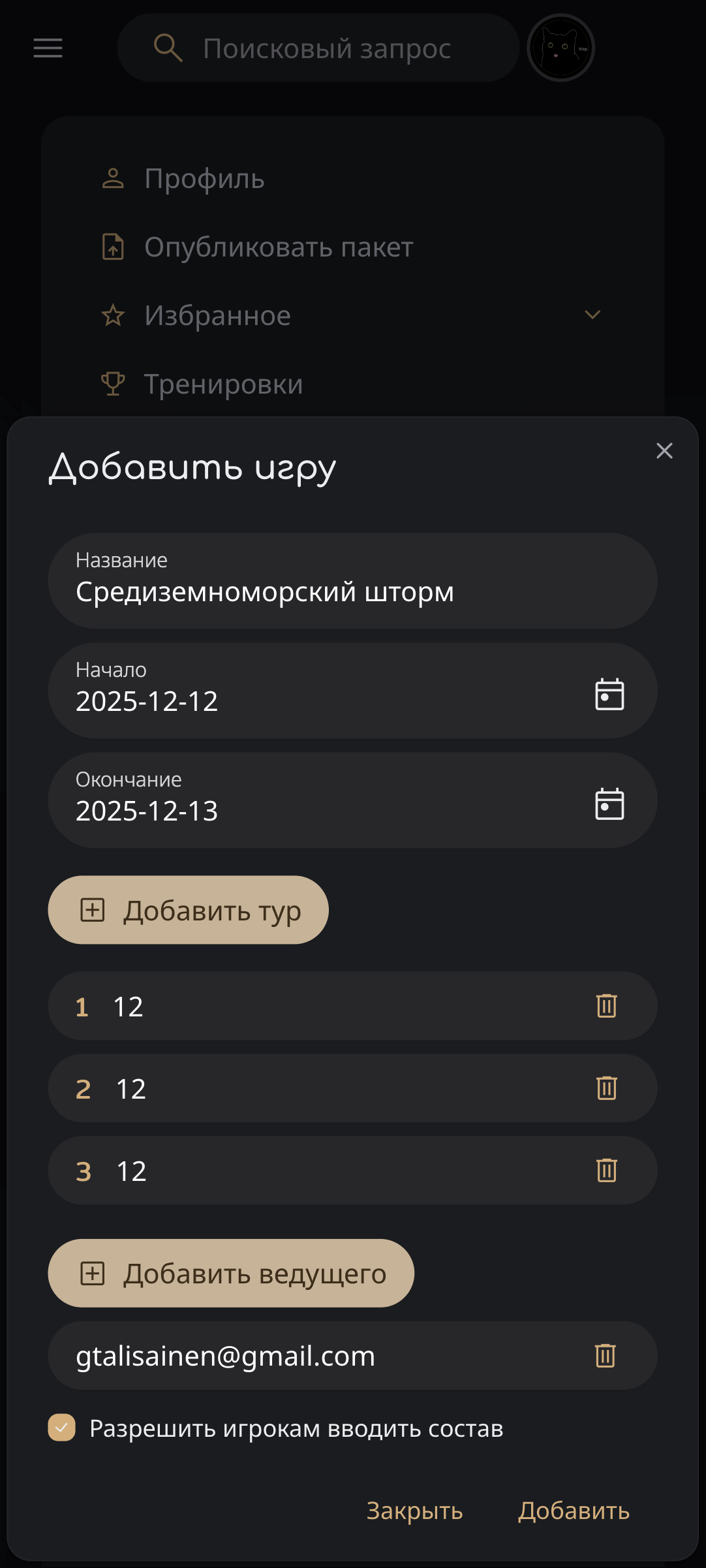 Перейдите к редактирования результатов игры нажав кнопку “Проведение”. Результаты можно внести тремя способами: