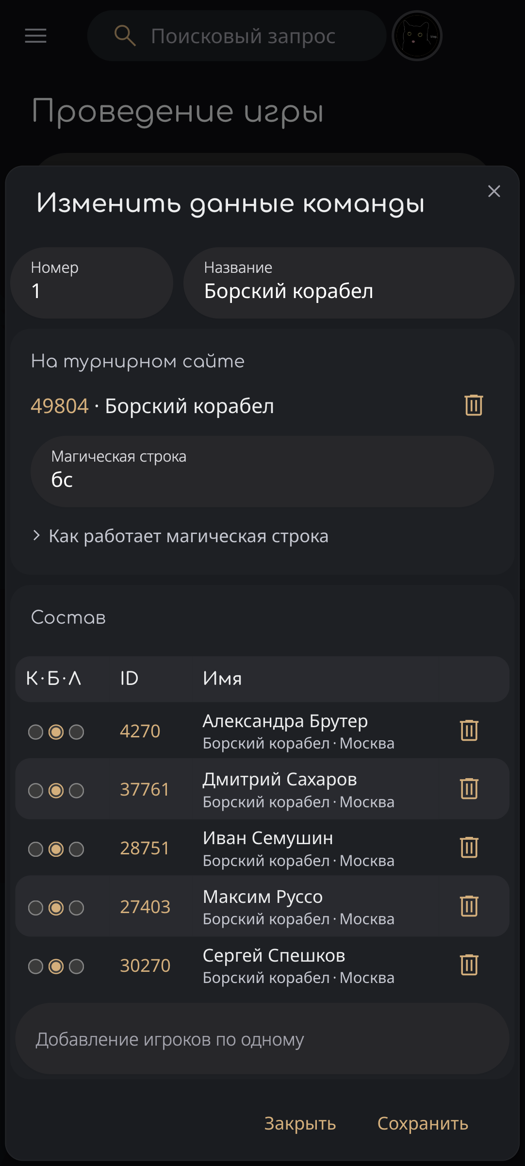 Вводить составы могут создавать игры, назначенный ведущий или сами игроки (если это разрешено в настройках). Ввод доступен только для команд, слинкованных с турнирным сайтом.