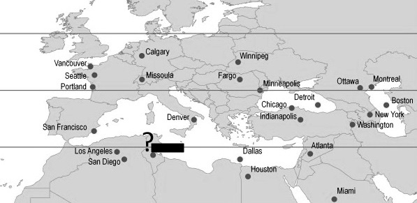 На этой карте городА Северной Америки перенесены на соответствующую широту в Евразию и Африку. В английском языке жителей города, название которого мы скрыли, называют так же, как и представителей древнего народа. Назовите этот народ.