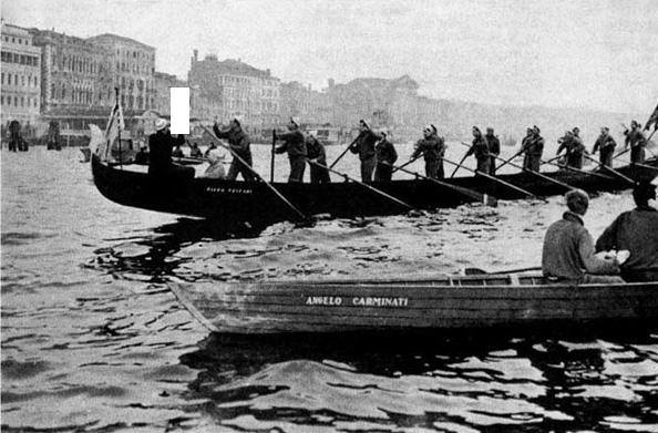 На фотографии, сделанной в конце января 1956 года, мы кое-что скрыли. Подпись под ней на одном из сайтов гласит: "ИКС на гондолах в Венеции". Назовите ИКС двумя словами, начинающимися с одной и той же буквы.
