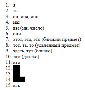 Список Сводеша — это инструмент для оценки степени родства между различными языками. Он представляет собой стандартизированный перечень базовых лексем данного языка, приблизительно упорядоченный по убыванию их "базовости" или исторической устойчивости. Перед вами первые пятнадцать слов стандартного списка Сводеша для русского языка. Восстановите слова под номерами 12, 13 и 14.