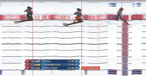 [Ведущим: раздатку нужно сделать по возможности большой, цветной и качественной, чтобы у команд не было сомнений, что она напечатана именно так, как задумано.] Перед вами фотофиниш забега на 5000 метров Лондонской Олимпиады 2012 года. В статье про этот снимок упоминаются 140 ИХ. Назовите ИХ.