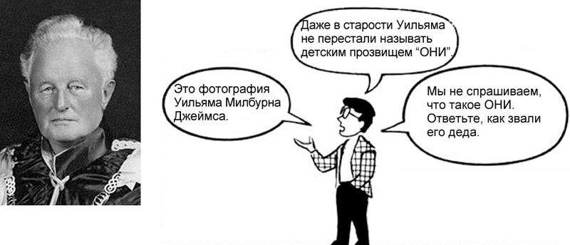 Это фотография Уильяма МИлбурна Джеймса. Даже в старости Уильяма не перестали называть детским прозвищем "ОНИ". Мы не спрашиваем, что такое ОНИ. Ответьте, как звали его деда.