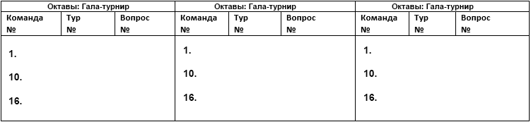 Мегаблиц. Ответы сдаются на одной из розданных карточек. Поскольку в мегаблице свыше двадцати вопросов, мы зададим только три американских под номерами 3, 8 и 19. Ответы на прочитанные вопросы сдавать не нужно. На карточках нужно написать ответы на французскую часть мегаблица – вопросы под номерами 1, 10 и 16, которые не будут прочитаны.