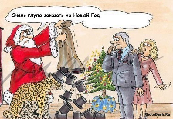 Перед вами юмористический рисунок на новогоднюю тему. Дед Мороз приносит в дом заказанные ему подарки со словами: "Очень глупо заказать на Новый Год...". Завершите его речь четырьмя словами.