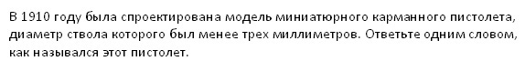 В 1910 году была спроектирована модель миниатюрного карманного пистолета, диаметр ствола которого был менее трех миллиметров. Ответьте одним словом, как назывался этот пистолет.