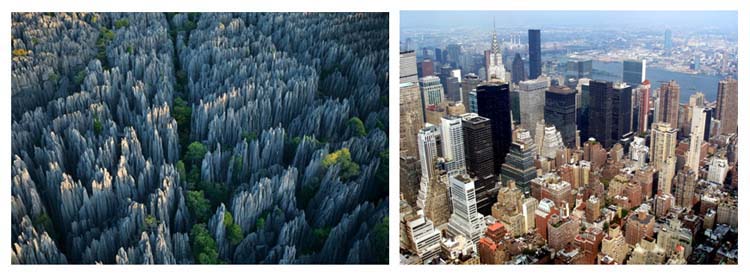 Слева — труднодоступный "лес" известняковых столбов на Мадагаскаре. Справа — панорама Нью-Йорка. Но авторы статьи в "National Geographic" [нэшнл джиогрЭфик] и фотограф Polotenchik дали к снимкам одинаковые подписи из двух слов. Воспроизведите эти подписи.