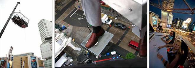 Висячий ресторан под названием "Dinner In The Sky" ("Обед в небе") поднимается на 50-метровую высоту с помощью специального крана. За подвешенным столом могут пообедать одновременно 22 человека, многие из которых признаЮтся, что есть им не хотелось. Но, тем не менее, персонал отмечает повышенный расход некоторых продуктов. А каких?