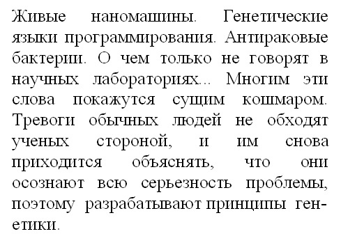 Прослушайте отрывок из статьи "Божественная машина" январского номера журнала "GEO": "Живые наномашины. Генетические языки программирования. Антираковые бактерии. О чем только не говорят в научных лабораториях... Многим эти слова покажутся сущим кошмаром. Тревоги обычных людей не обходят ученых стороной, и им снова приходится объяснять, что они осознают всю серьезность проблемы, поэтому разрабатывают принципы ген-етики". В этом отрывке мы заменили всего одну букву. Какую?
