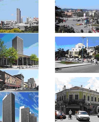 Слева вы видите окающие здания, расположенные в Америке. Справа вы видите акающие здания, расположенные в Европе. Какие слова были заменены словами "окающие" и "акающие"?