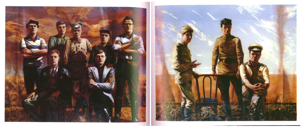 Перед вами картины украинского художника Сергея Шерстюка. Обе они называются «Мужчины одной семьи». Напишите год, который входит в название первой картины, и год, который входит в название второй.