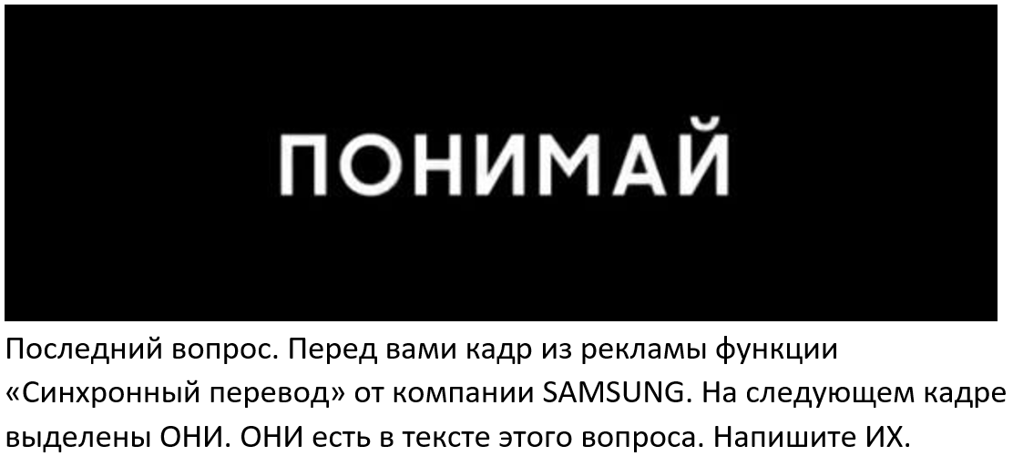 [Ведущему: Текст этого вопроса написан на английском языке. Если от команд будут какие-то вопросы по этому поводу – нужно игнорировать их до оглашения комментария. Если вы не знаете или плохо говорите по-английски, прочитайте данную транскрипцию: Зэ ласт квэсшн. Ин фронт оф ю из а фрэйм фром эн эдвёртисмэнт фор зе симултэ́йнос транслэ́йшн фиче́ бай Самсу́нг. Ин зэ некст фрейм, ЗЕЙ а хайла́йтед. ЗЕЙ а ин зе тэкст оф зис квэсшн. Райт ЗЭМ.] The last question. In front of you is a frame from the advertisement for the "Simultaneous Translation" feature by SAMSUNG. In the next frame, THEY are highlighted. THEY are in the text of this question. Write THEM.