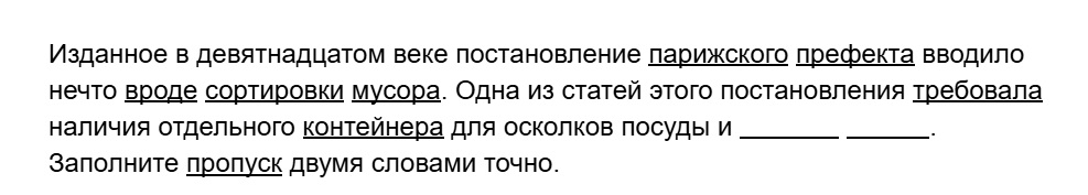 Изданное в девятнадцатом веке постановление парижского префекта вводило нечто вроде сортировки мусора. Одна из статей этого постановления требовала наличия отдельного контейнера для осколков посуды и… Заполните пропуск двумя словами точно.