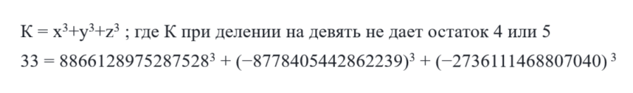 Итак, финальный вопрос. Согласно гипотезе, натуральные числа можно представить в виде суммы кубов трех целых чисел. Недавно было найдено решение для К=33, после чего в первой сотне натуральных чисел лишь для одного К решения пока нет. Для какого К?