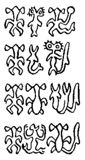 Анализируя текст одной из табличек ро́нго-ро́нго, Николай Бути́нов и Юрий Кно́розов выделили несколько идущих подряд блоков по три символа и предложили их толкование. Согласно их гипотезе, в каждом блоке средний символ обозначает ПЕРВОЕ, а последний символ — аналог ВТОРОГО. Назовите ПЕРВОЕ и ВТОРОЕ.
