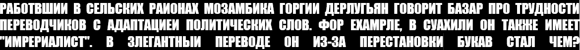 Работавший в сельских районах Мозамбика Георгий Дерлугья́н рассказывает о трудностях, с которыми сталкивались переводчики при адаптации политической лексики. Например, на суахили ОН получил еще и значение “империалист”. В известном переводе ОН из-за перестановки букв превратился … во что?
