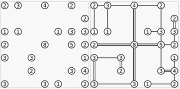 Перед вами пример японской головоломки и её решение. Таким образом, задача состоит в построении связного графа по вершинам заданной степени, при этом кратность рёбер не должна превышать двух. Название этой головоломки переводится как призыв создавать ИКСы. Назовите ИКС.
