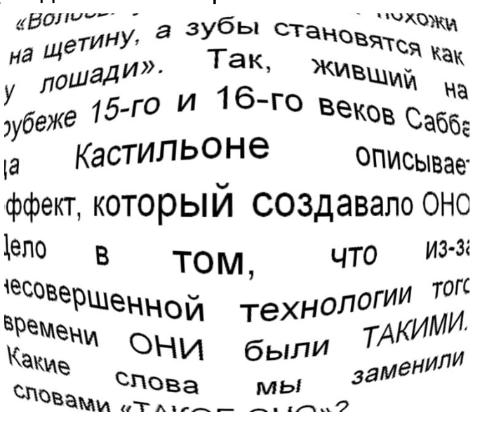 «Волосы уменьшаются и похожи на щетину, а зубы становятся как у лошади». Так, живший на рубеже 15-го и 16-го веков Са́бба да Кастильо́не описывает эффект, который создавало ОНО. Дело в том, что из-за несовершенной технологии того времени ОНИ были ТАКИМИ. Какие слова мы заменили словами «ТАКОЕ ОНО»?