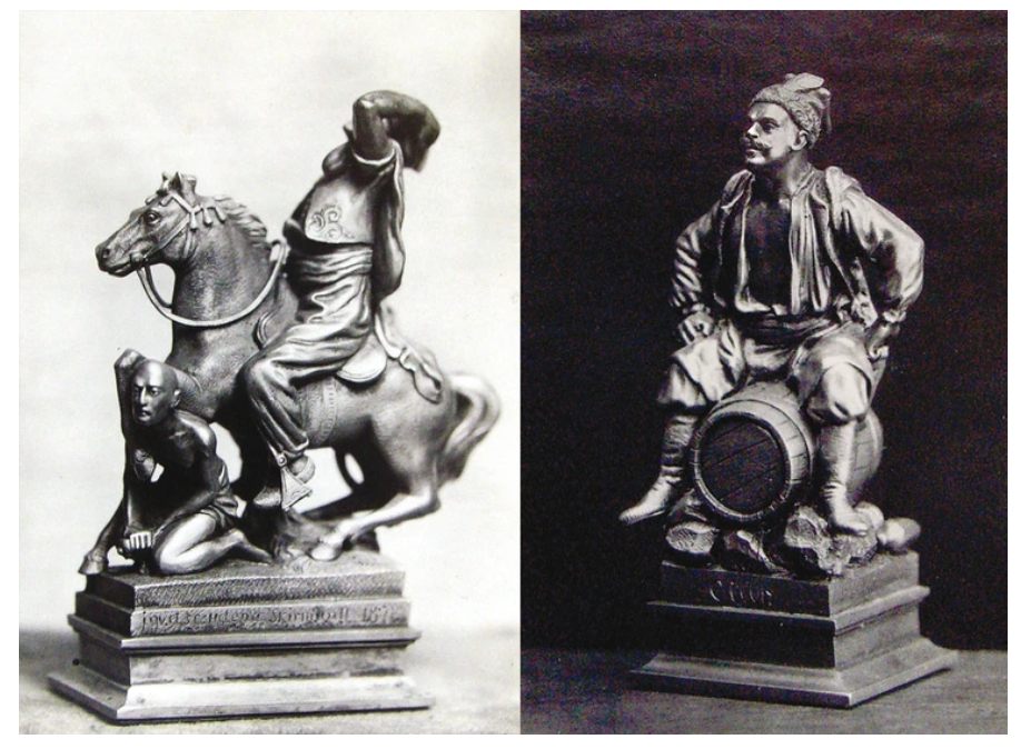Слева на раздаточном материале выполненный скульптором Геленой Скирмут воин-кавалерист, а справа - обозный прислужник. Обозный прислужник выступал в качестве АЛЬФЫ, поэтому этих прислужников было в несколько раз больше. Какое слово мы заменили на АЛЬФУ.
