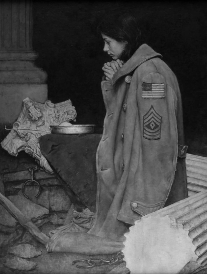 Согласно одному мнению, беженка с картины Но́рмана Ро́квелла, созданной в 1943 году, является ЕЮ. Назовите ЕЁ двумя существительными, которые начинаются на гласные буквы.