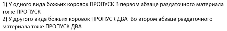 У одного вида божьих коровок ПРОПУСК. В первом абзаце раздаточного материала тоже ПРОПУСК. У другого вида божьих коровок ПРОПУСК ДВА. Во втором абзаце раздаточного материала тоже ПРОПУСК ДВА. Заполните ПРОПУСКИ, каждый двумя словами, в любом порядке.