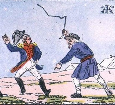 На этой карикатуре 1812 года русский мужик говорит французскому солдату: