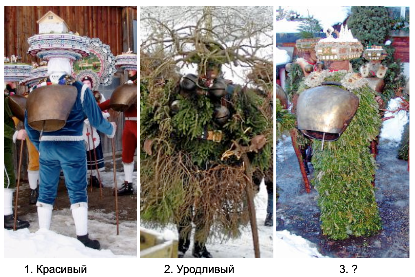 Перед вами костюмы кантона Аппенцель, в котором существует традиция смешивать несколько праздников в один. Каким словом, пишущимся через дефис, называется третий костюм?
