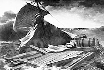 В вопросе несколько раз заменяются два слова на одну букву. В одном фильме Ренуар, изображая персонажа ТАК, просит натурщика надеть галстук. В этом же фильме Тулуз-Лотрек заявляет натурщице, что она грустная даже ТАК. Ответьте тремя словами, где находится, изображённый ТАК, персонаж картины 1818 года?