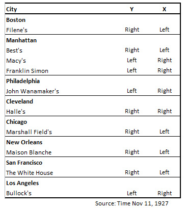Многие традиции имеют относительно недавнее происхождение. Свидетельство одного из таких примеров — розданный вам материал из газеты "Time" [тайм]. В левой колонке указаны универмаги различных городов США, а в правой — преобладающий в определенной части ассортимента признак. Догадавшись, что мы заменили на "X" и "Y", напишите, какие слова мы заменили на "Left" [лефт] и "Right" [райт].