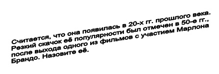 Считается, что ОНА появилась в 20-х годах прошлого века. Резкий скачок ЕЕ популярности был отмечен в 50-е годы, после выхода одного из фильмов с участием Марлона Брандо. Назовите ЕЕ.