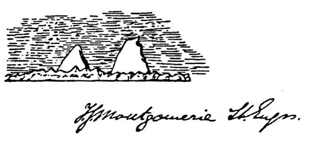 Перед вами рисунок, выполненный сотрудником британской топографической службы Томасом Монтгомери. С рисунка мы убрали четыре символа, два из которых одинаковые. Укажите эти одинаковые символы в ответе.