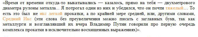Перед вами отрывок из статьи Андрея Колесникова об открытии цеха в Магнитогорском металлургическом комбинате. Москвичи тоже напишут Средний Икс с заглавных букв. Какие два слова мы заменили на "Средний Икс"?