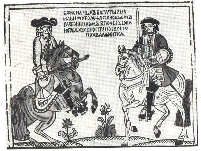 Перед вами — лубок "Бой сильных богатырей Ильи Муромца и Соловья Разбойника". Искусствовед Стасов считал, что на лубке изображены реальные люди схожего статуса. Назовите этих людей.