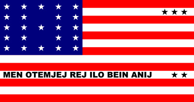 Перед вами флаг одной территории. 23 звездочки в левом верхнем углу символизируют 23 острова, входящих на сегодняшний день в состав этой территории. Слова на флаге были сказаны вождем местного племени в 1946 году, и означают "Всё в руках Господа". Догадавшись, что символизируют черные звездочки на флаге, ответьте, как называется эта территория.