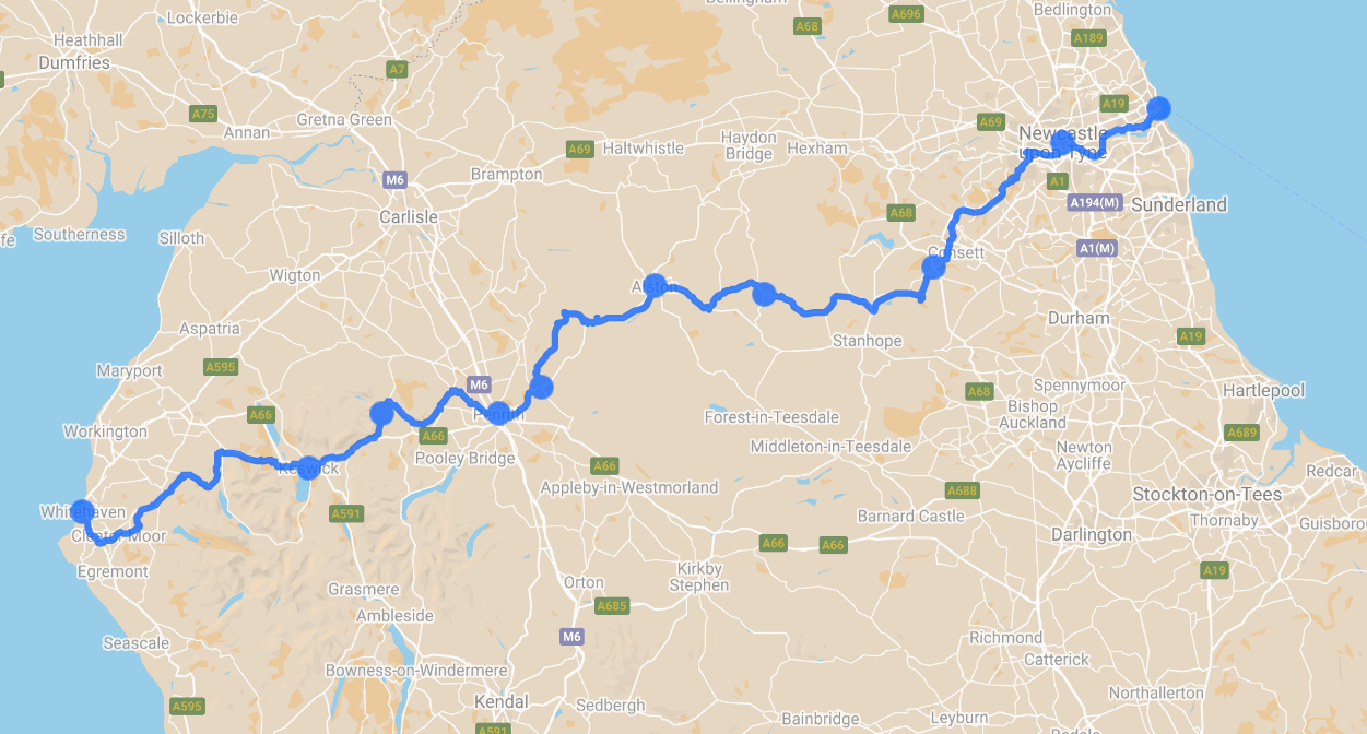 Перед вами карта велосипедного маршрута Уайтхэвен–Тайнмут, проходящего через территорию всей Англии. Напишите сокращённое название этого маршрута, состоящее из трёх символов.