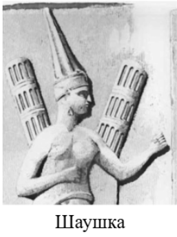 Шау́шка – хеттская богиня плодородия. Её имя иногда записывают с добавлением буквы В [вэ], поэтому шутят, что свитки за спиной богини на самом деле сделаны из НЕГО. Что такое ОН?