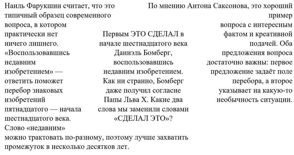 Редактор благодарит за тестирование вопросов и ценные замечания следующих замечательных людей: Дина Але́ева, Дмитрий Ве́ликов, Денис Галиакбе́ров, Артём Гуле́цкий, Юлия Дидбари́дзе, Александр Ерми́шкин, Антон Карпие́вич, Иван Киселёв, Евгений Ковате́нков, Валентин Копоче́ль, Александр Коробе́йников, Анна Коро́бкина, Максим Мерзляко́в, Леонид Ми́хлин, Павел Парфиано́вич, Александр Петрако́в, Владислав Пупшино́вич, Александр Рожде́ствин, Антон Саксо́нов, Темирла́н Сафаргали́ев, Артём Семёнов, Дмитрий Стальну́хин, Наи́ль Фару́кшин, Иван Фроло́в, Роман Фроло́в, Никита Шеве́ла, Серафим Шиба́нов, Юлия Шле́зингер и Николай Афо́нин.