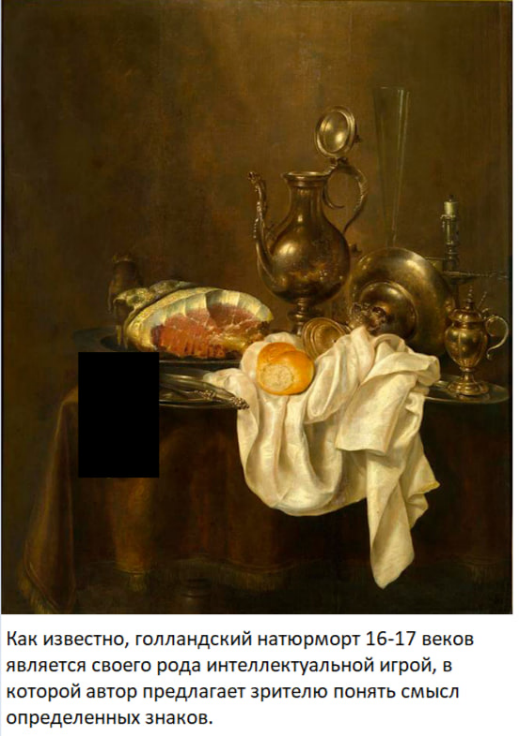 Предметы на картине Геррита Виллемса Хеды выбраны не случайно. Так, например, погасшая свеча – олицетворение бренности и мимолетности жизни, высокий стеклянный бокал указывает на её хрупкость, ветчина – на плотские удовольствия. А символом двуличия и предательства на картине является ОН. Восстановите слово из предыдущего предложения, в котором мы пропустили буквы.