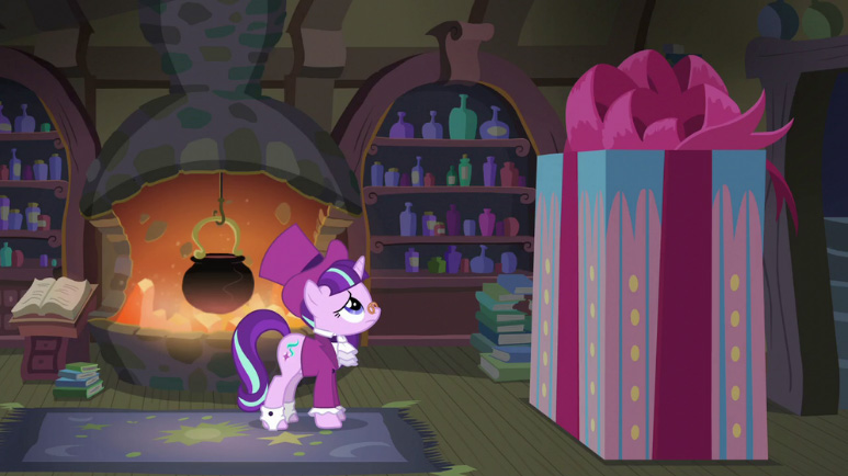 Когда изображенный на картинке персонаж сериала "My Little Pony" задает одному из своих незваных гостей уточняющий вопрос, гость отвечает, что речь идет именно о подарках. Какими тремя словами в русском переводе представлялся литературный прототип этого гостя?