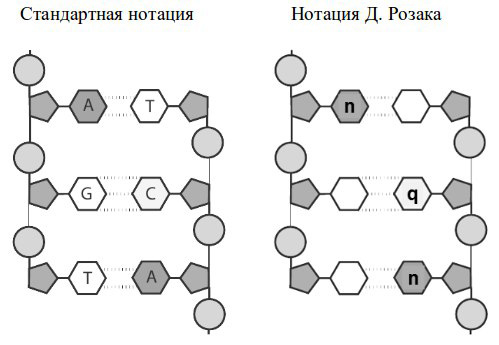 Нуклеотиды (составляющие молекулы ДНК) обычно обозначаются буквами A, C, G, T. Но Дэвид Розак предложил другие четыре строчные буквы. Для аденина он предложил букву "n", а для цитозина — "q". Какие еще две буквы используются в его нотации?