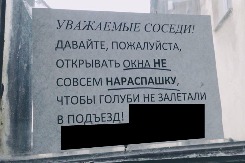Объявление, размещенное в петербургском многоквартирном доме, гласило: "Уважаемые соседи, давайте, пожалуйста, открывать окна не совсем нараспашку, чтобы голуби не залетали в подъезд!". Кто-то сделал приписку к этому объявлению, в которой упомянул имя собственное. Напишите это имя собственное.