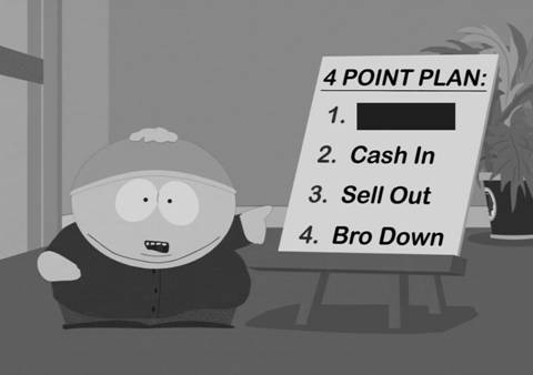 [Ведущему: Не зачитывать текст раздатки.] Второй пункт можно перевести как "Срубить бабла". Третий — "Закрыть лавочку". Четвёртый — "Оттянуться с корешами". Воспроизведите первый пункт в оригинале.