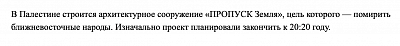 В Палестине строится архитектурное сооружение «ПРОПУСК Земля», цель которого — помирить ближневосточные народы. Изначально проект планировали закончить к 2020 году. Какое слово мы пропустили?